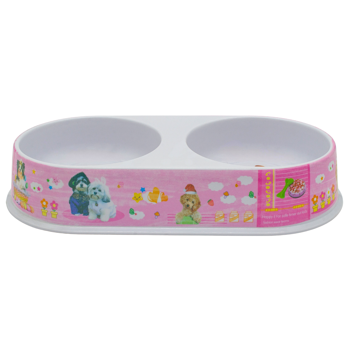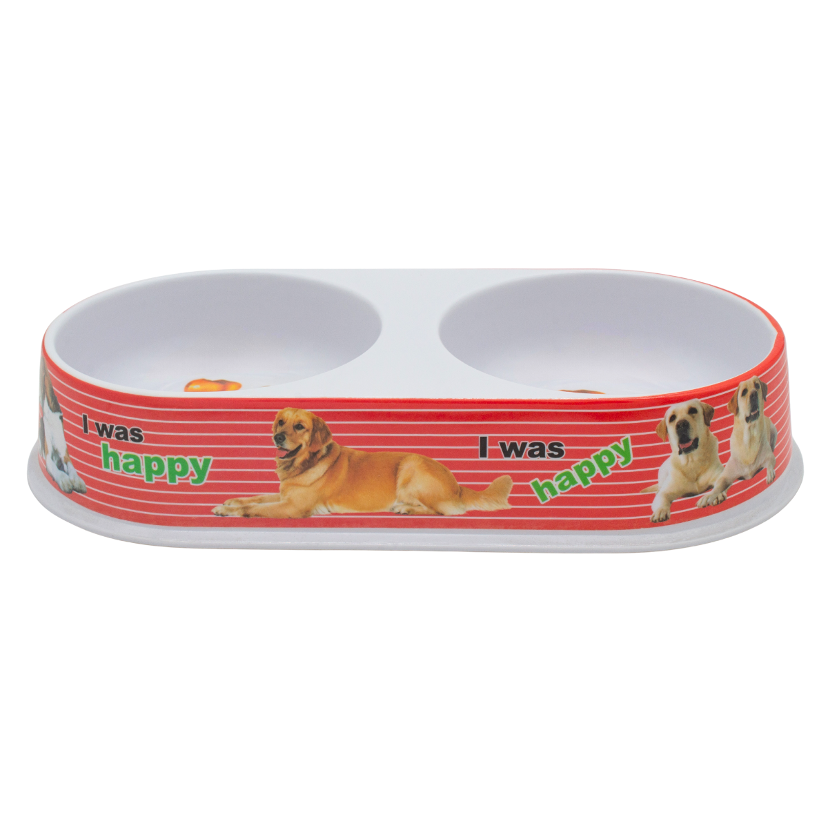 Plato doble con diseño amplio y decorado, ideal para servir comida y agua en un solo recipiente.