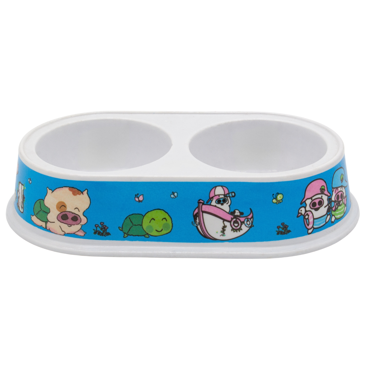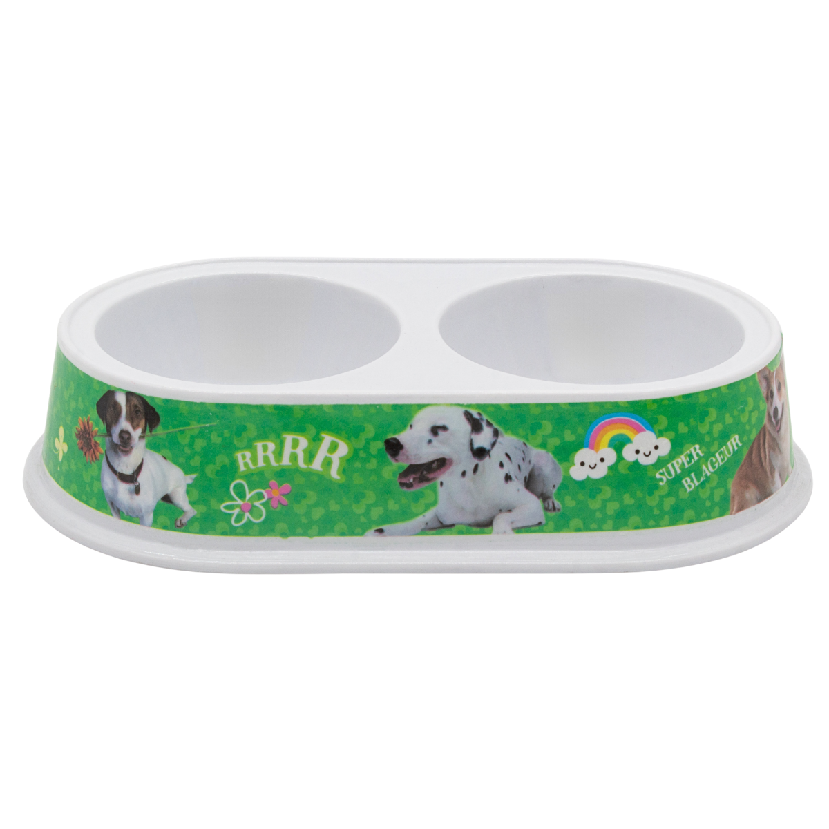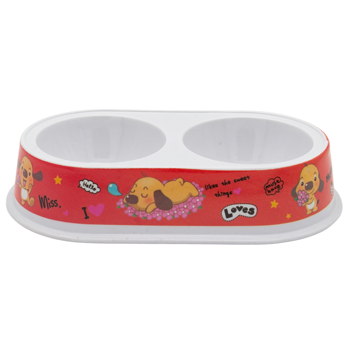 Plato doble con diseño práctico y decorado, ideal para servir comida y agua en un solo lugar.
